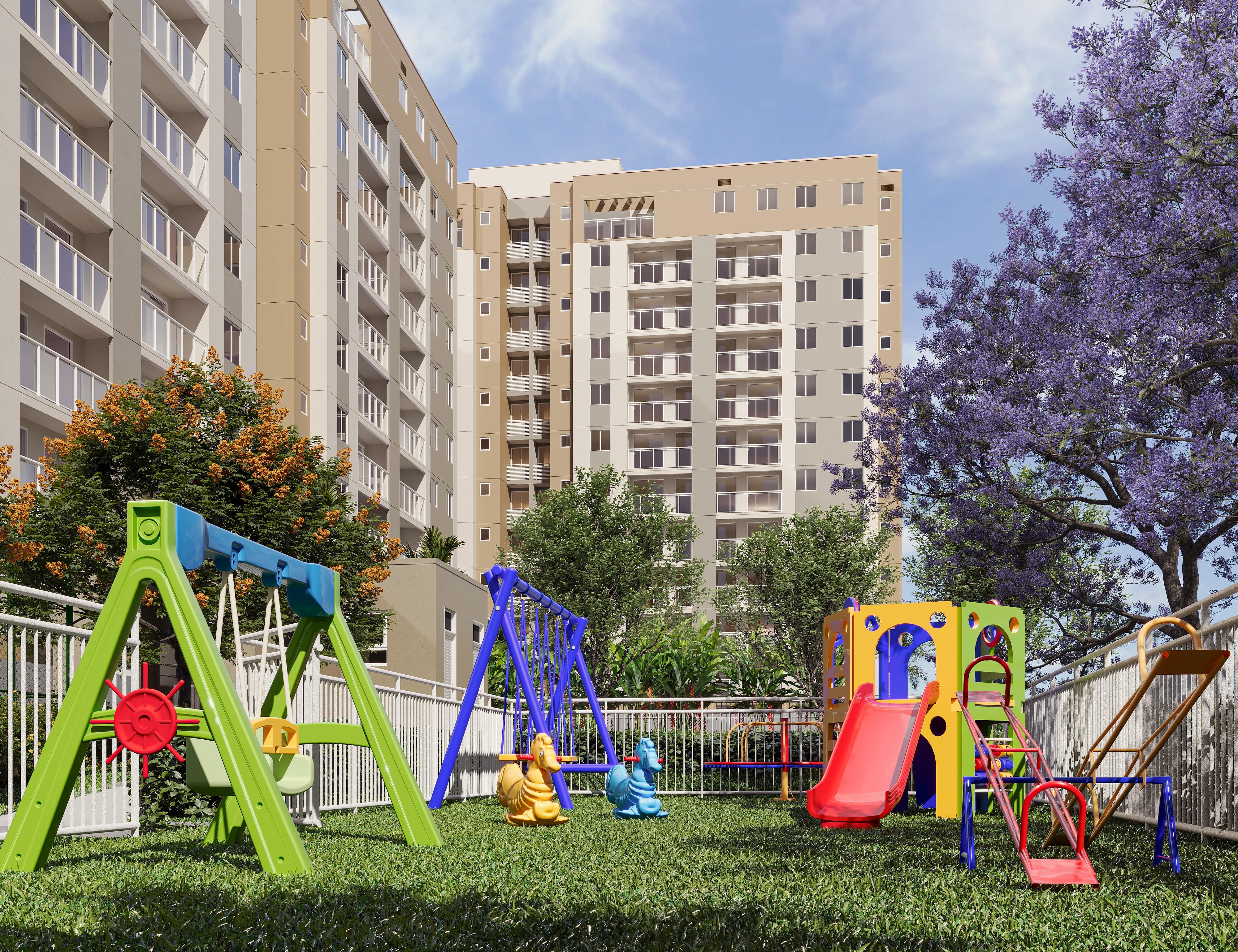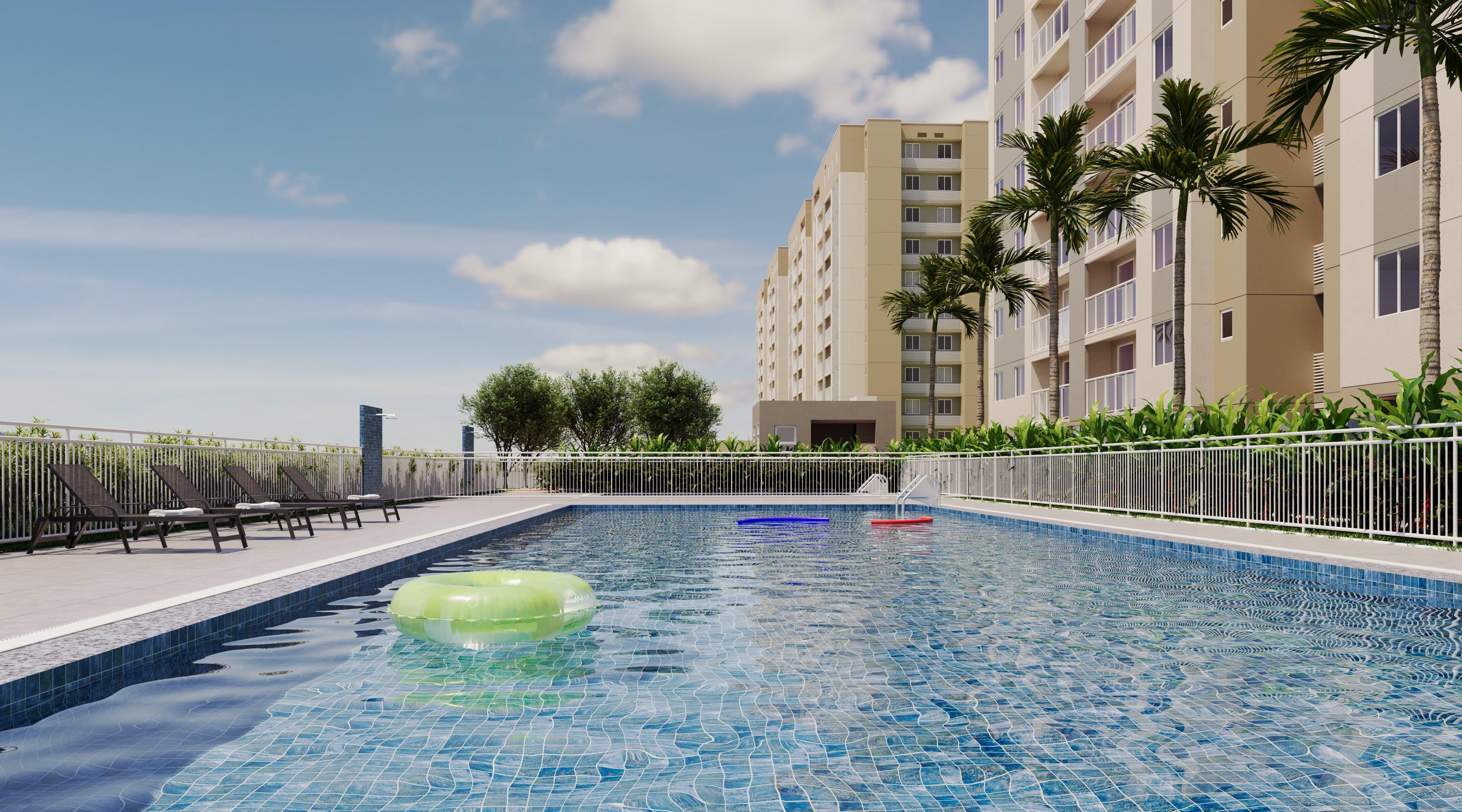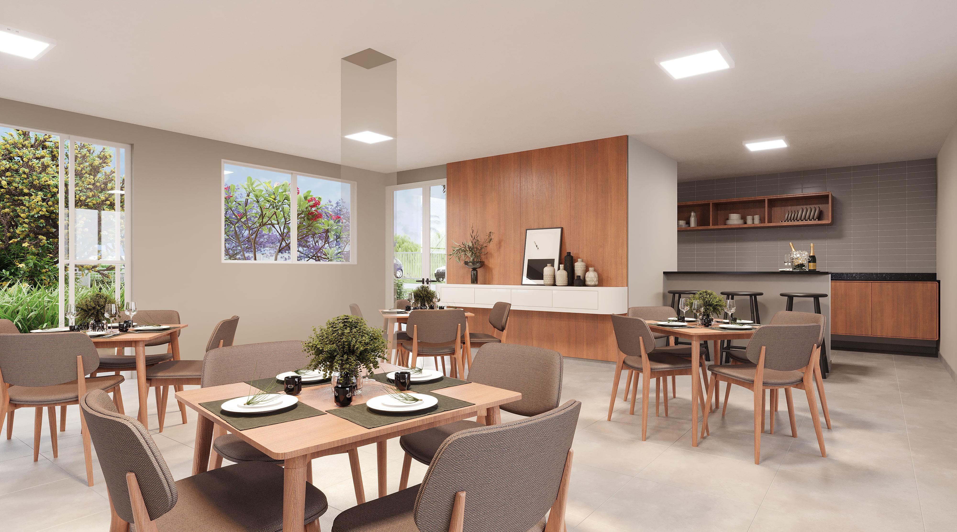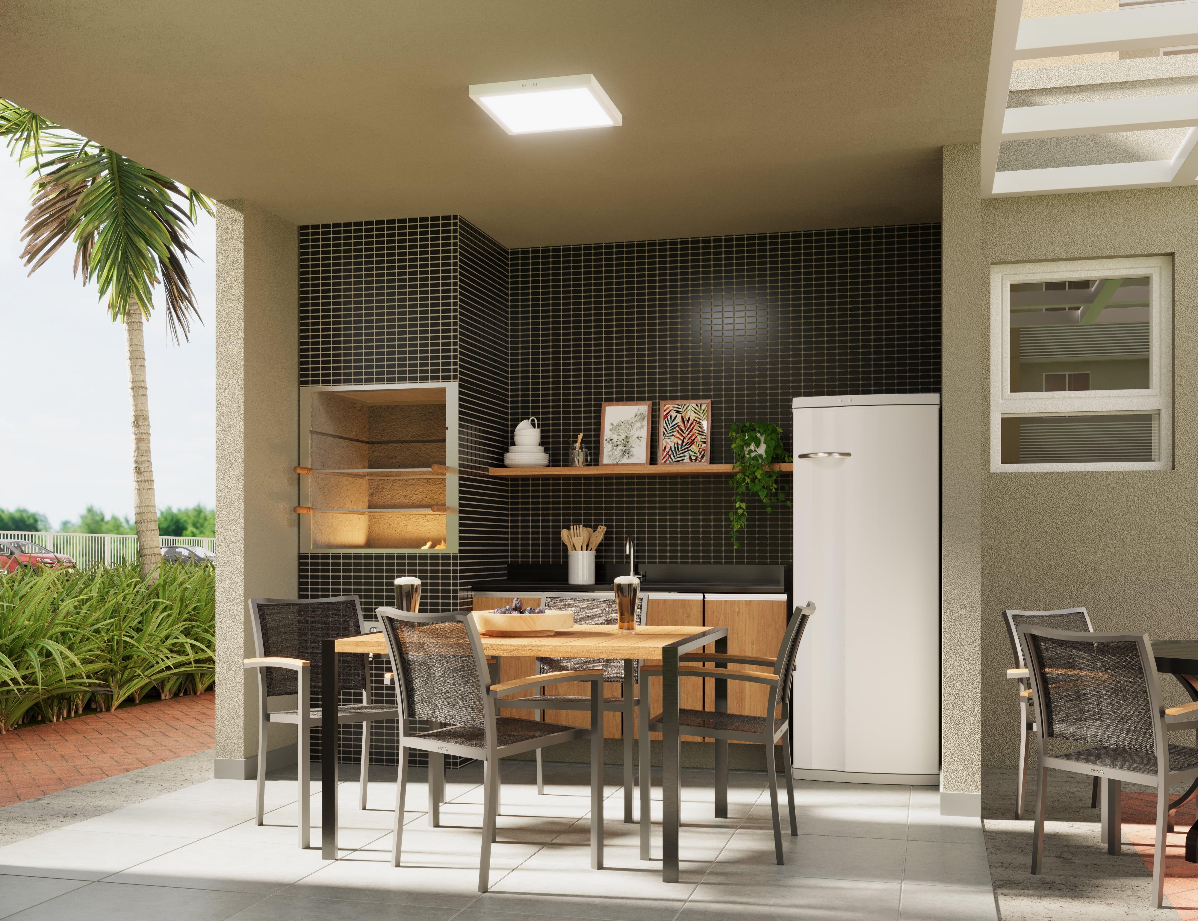 Composição: 02 (dois) quartos, sendo 01 (um) suíte, sala para 02 (dois) ambientes, cozinha e área de serviço integradas, 01 (um) banheiro social e varanda.