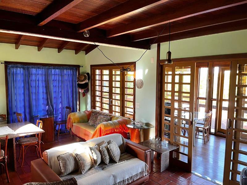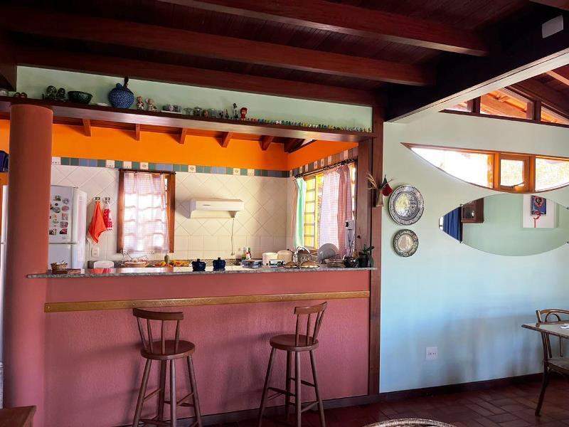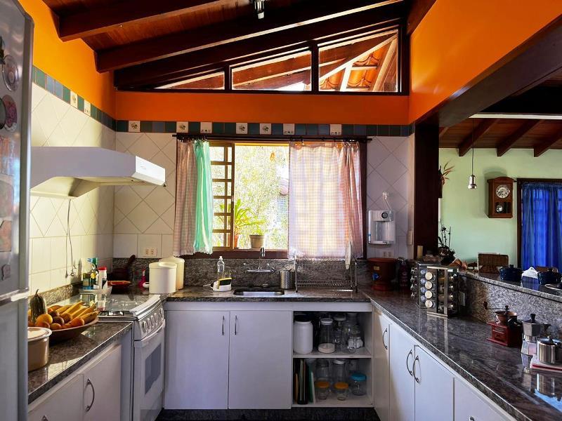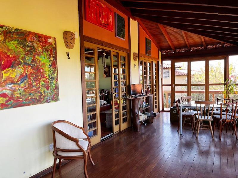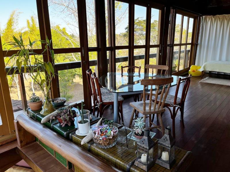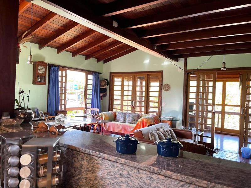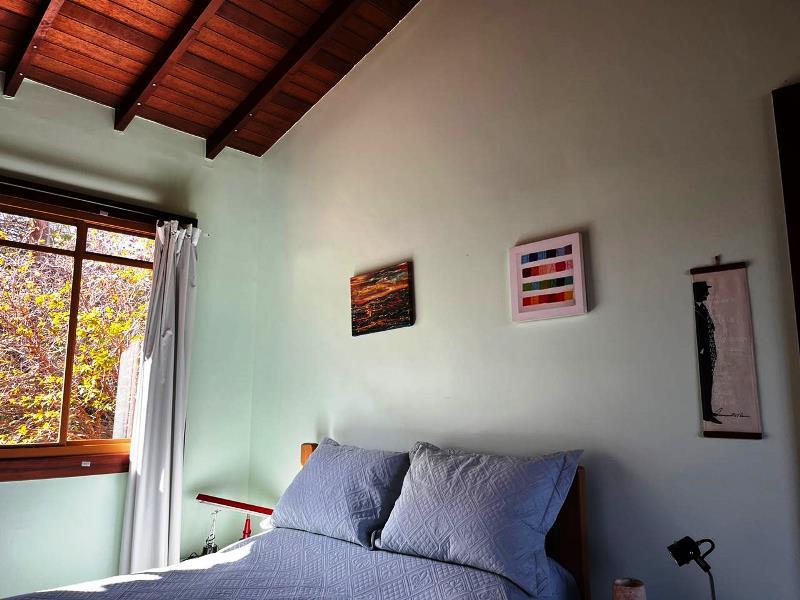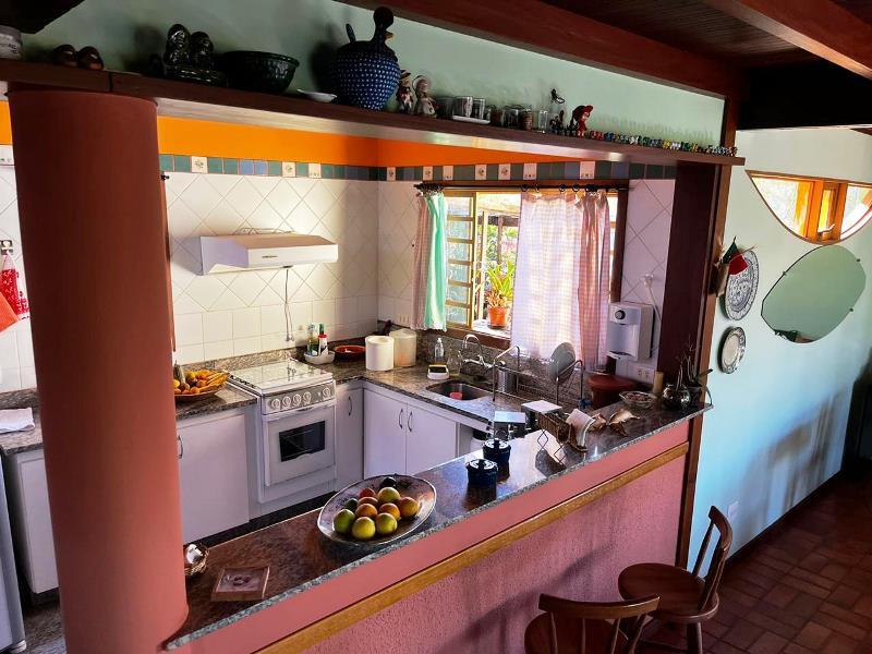 O teto é inclinado em madeira. Do hall ainda, escada Santos Dumont para varanda superior em ipê. Portas interligam ao jardim – o verde está sempre dentro da casa. Da varanda acesso a estar, jantar integrados à cozinha. Aqui o piso é cerâmica Ely, teto e estrutura em ipê. Lavabo com banheiro. Escada Santos Dumont para acesso à suíte superior – também com vistas amplas para a natureza. Nesta parte da casa um outro sistema de energia solar. Contíguo à cozinha, com piso e bancadas em granito, pequena lavanderia ligada a área de serviço externa com armários diversos, inclusive para dois bujões de gás. Aqui uma porta de acesso ao jardim, pomar e na parte externa um pequeno viveiro para plantas, pequena horta... E então caminho para o canil com duas baias, passando por acerola, limão, laranjas e a jabuticabeira. Há ainda um banheiro externo para apoio em reunião com amigos. Bancos sob mangueiras, limoeiro, mexeriqueiras...Ainda espaço para pérgola, e garagem coberta. A casa foi disposta em um quadrante do terreno de modo que há muito espaço livre para ampliação ou piscina, churrasqueira.