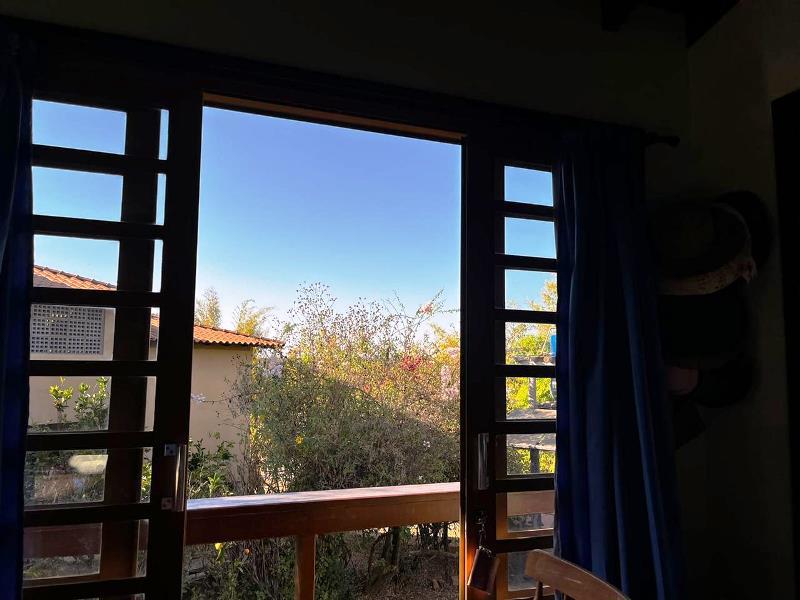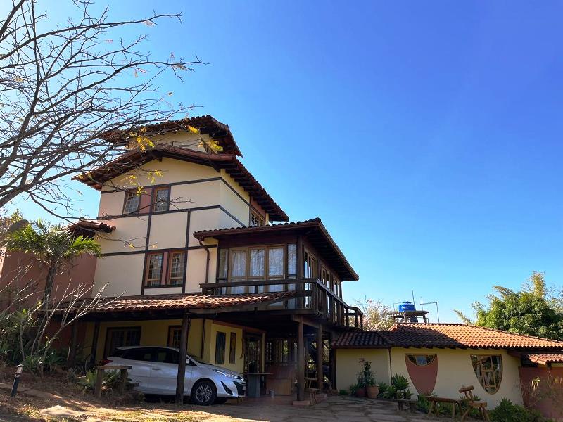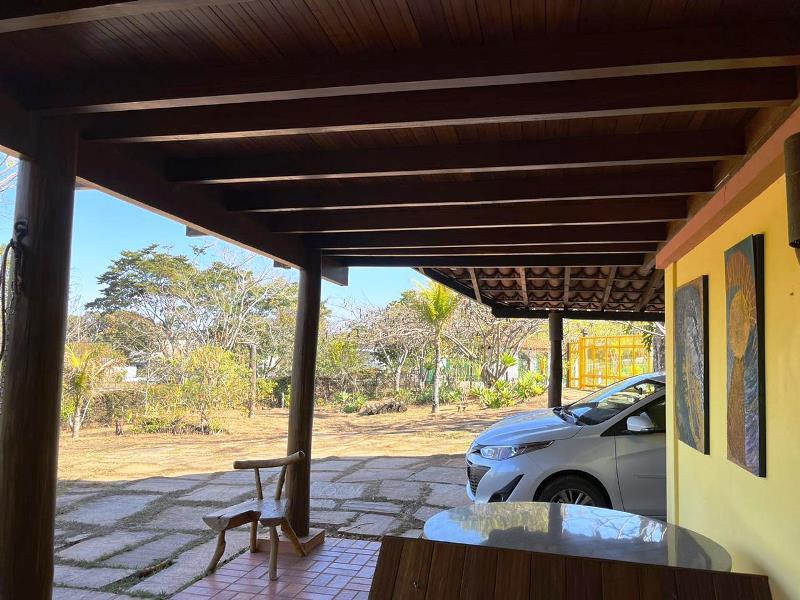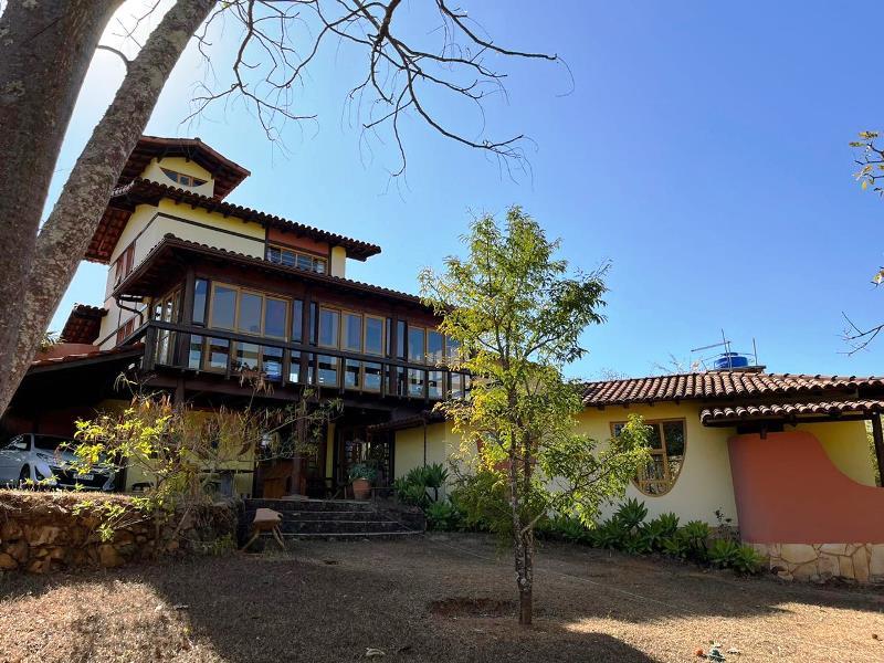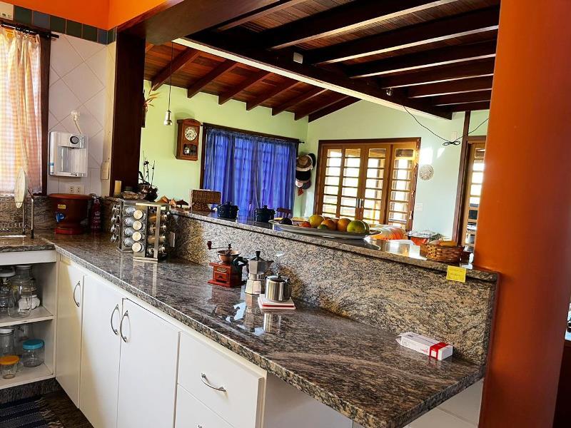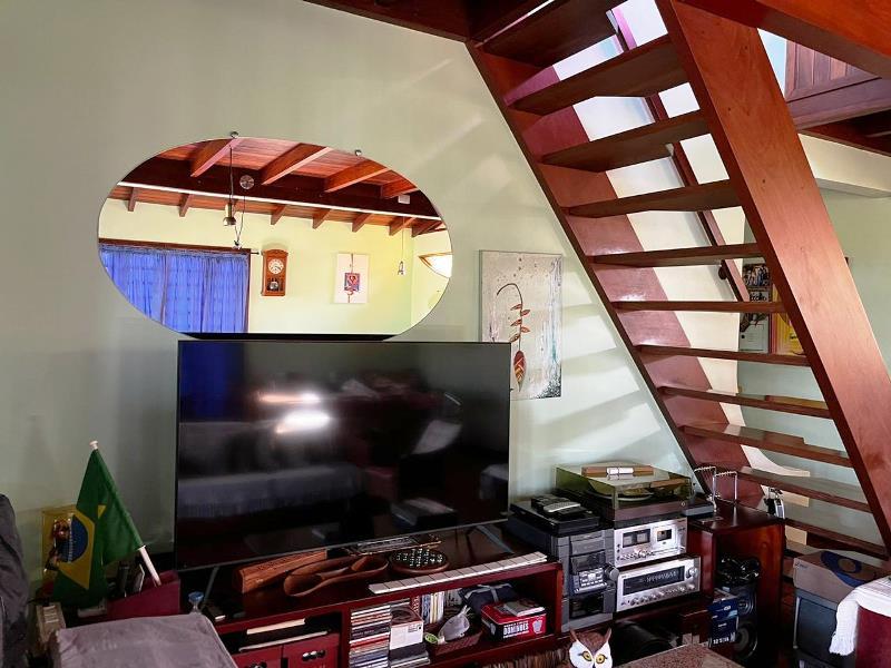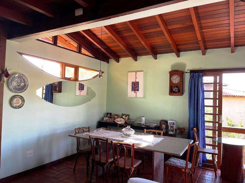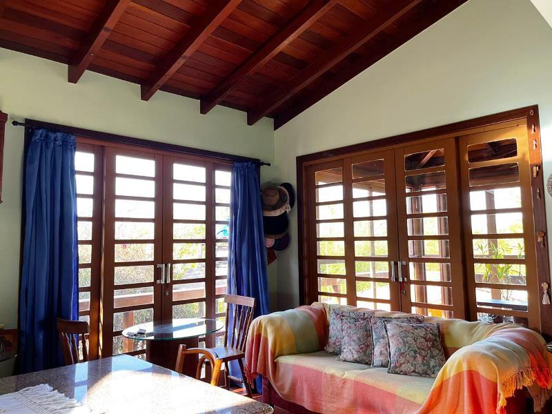 O teto é inclinado em madeira. Do hall ainda, escada Santos Dumont para varanda superior em ipê. Portas interligam ao jardim – o verde está sempre dentro da casa. Da varanda acesso a estar, jantar integrados à cozinha. Aqui o piso é cerâmica Ely, teto e estrutura em ipê. Lavabo com banheiro. Escada Santos Dumont para acesso à suíte superior – também com vistas amplas para a natureza. Nesta parte da casa um outro sistema de energia solar. Contíguo à cozinha, com piso e bancadas em granito, pequena lavanderia ligada a área de serviço externa com armários diversos, inclusive para dois bujões de gás. Aqui uma porta de acesso ao jardim, pomar e na parte externa um pequeno viveiro para plantas, pequena horta... E então caminho para o canil com duas baias, passando por acerola, limão, laranjas e a jabuticabeira. Há ainda um banheiro externo para apoio em reunião com amigos. Bancos sob mangueiras, limoeiro, mexeriqueiras...Ainda espaço para pérgola, e garagem coberta. A casa foi disposta em um quadrante do terreno de modo que há muito espaço livre para ampliação ou piscina, churrasqueira.